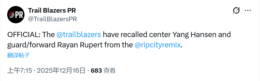 北京时间12月16日,NBA常规赛继续进行。开拓者队官方宣布,球队从G联赛混音队召回杨瀚森和吕佩尔。杨瀚森今天出战了混音队与国王队的比赛,并且打出了非常出色的表现,获得了主帅斯普利特的赞美。