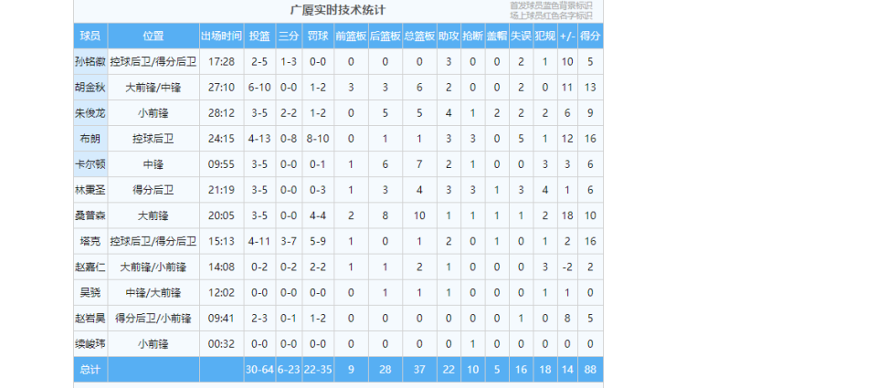 广厦男篮首轮击败山西男篮得到88分
