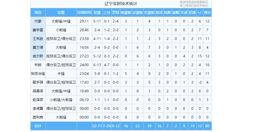 其中外援莫兰德得到4分,威尔斯得到12分,布朗得到16分。外援累计得到32分,外援得分占比为40%。
