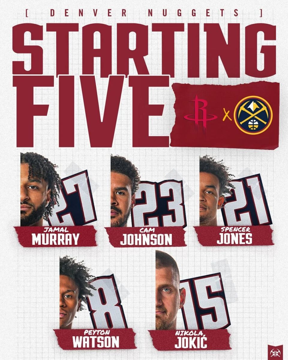 这是两队本赛季第二次交手,上个月掘金112-109险胜火箭。掘金本场首发:穆雷、卡梅伦-约翰逊、沃特森、斯潘塞-琼斯、约基奇。火箭首发:阿门、奥科吉、杜兰特、小贾巴里-史密斯、申京。只看首发配置,火箭更均衡一些。