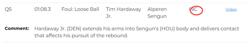 第二次是漏判,发生在距离比赛结束还有1分8秒,申京拼抢篮板时,突然摔倒在地,裁判没有任何回应。裁判报告指出,这一个回合是小哈达威伸手推在申京的身上,这次身体接触干扰了申京的篮板拼抢。这是一次漏吹的抢篮板犯规,同样是掘金获利,火箭吃亏。