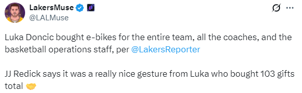 北京时间12月17日,湖人当家球星卢卡-东契奇开始送圣诞礼物了,狂送103辆电动自行车,雷迪克直言这举动太贴心了。