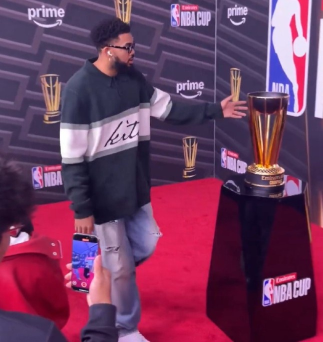 在女友的加油打气下,唐斯出战29分40秒的时间,12投6中,砍下16分11篮板1助攻的数据。在赛前,唐斯路过NBA冠军奖杯的时候顺手摸了一下。最终,凭借着唐斯在内线的优势,以及阿奴诺比最后出色表现,尼克斯夺得了NBA杯冠军。