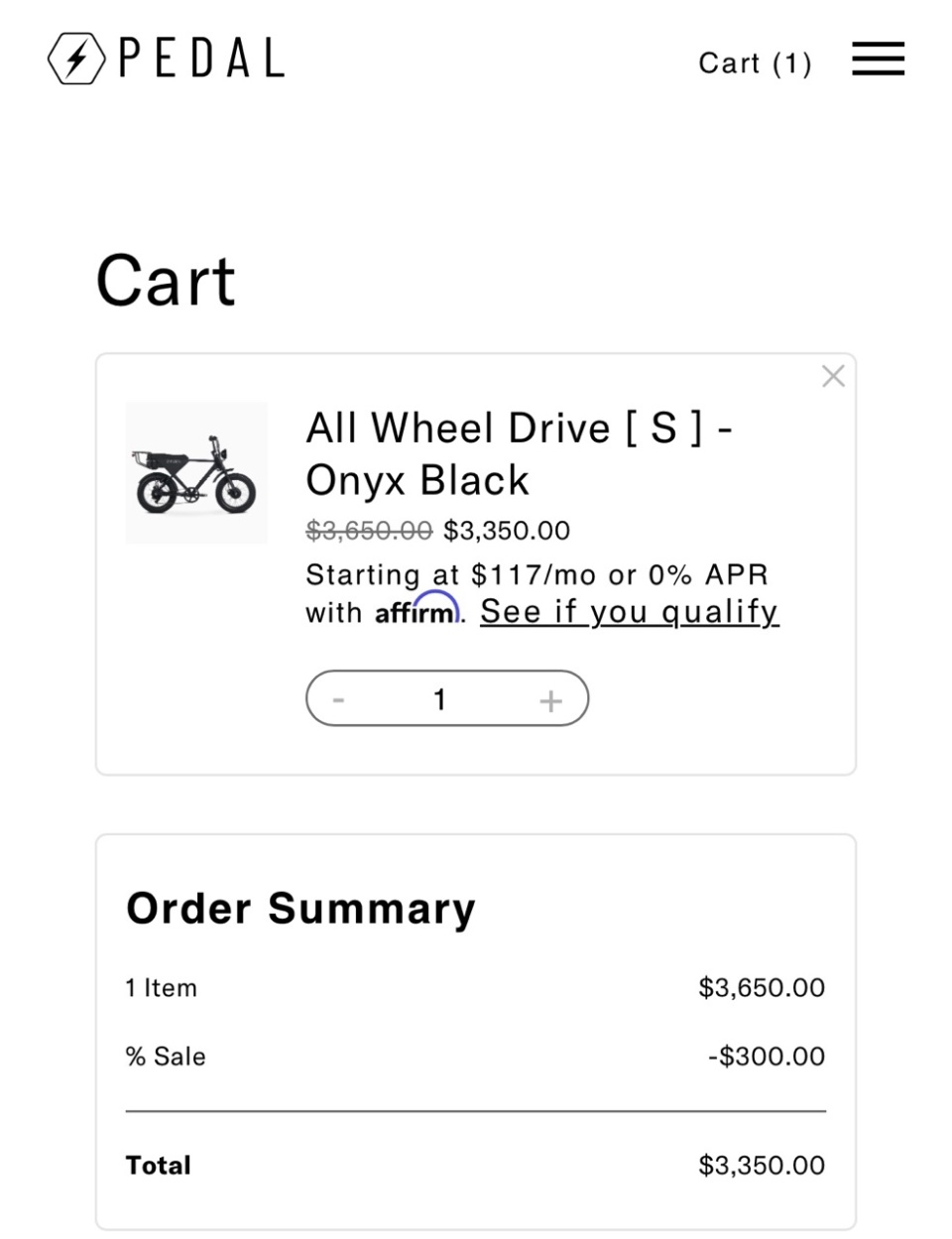 据我们仔细搜索比对发现这辆电动自行车是著名品牌Pedal Electric旗下的一款高端的全轮驱动(All-Wheel Drive)S系列的电动自行车,该品牌与2020年创立,颜色则是玛瑙黑色,这辆电动自行车的初始售价为3650美元,现在则是有300美元的优惠,价格为3350美元。
