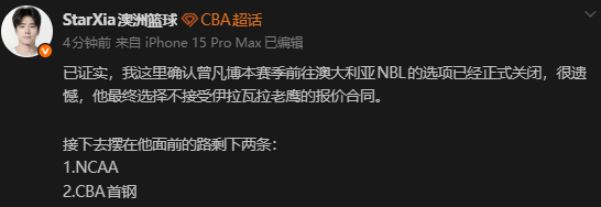 “已证实,我这里确认曾凡博本赛季前往澳大利亚NBL的选项已经正式关闭,很遗憾,他最终选择不接受伊拉瓦拉老鹰的报价合同。接下去摆在他面前的路剩下两条:1.NCAA;2.CBA首钢。”