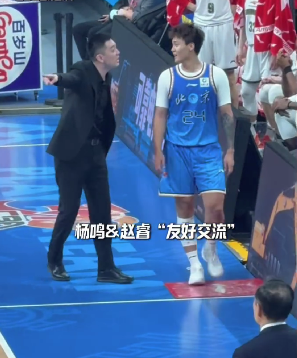 身为北京队球员的赵睿被杨鸣拉住后,从茫然无措到忍俊不禁,全程未附和或反驳,被网友调侃“低头看球衣确认阵营”。