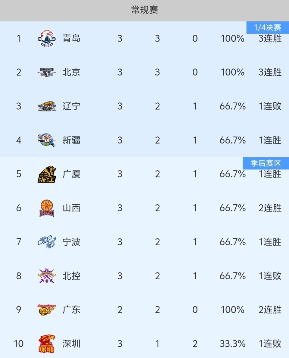 随着新疆105-95赢球、浙江三连败,CBA最新积分榜出炉:青岛第一!