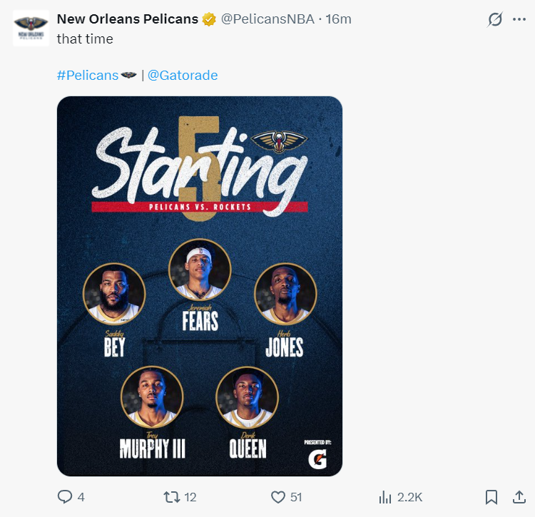 鹈鹕这边锡安-威廉森依旧是以替补的身份出战。
