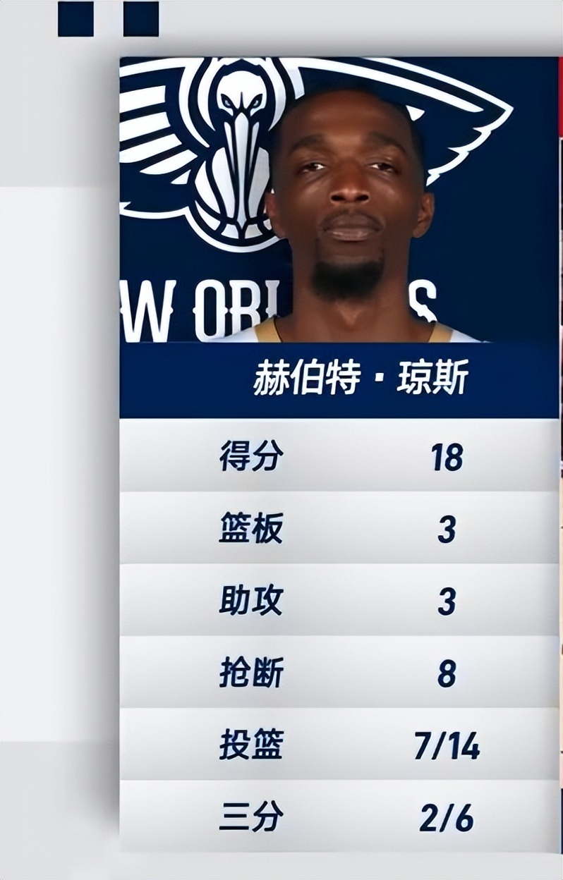 琼斯8个抢断生涯最多,追平鹈鹕队史最高。