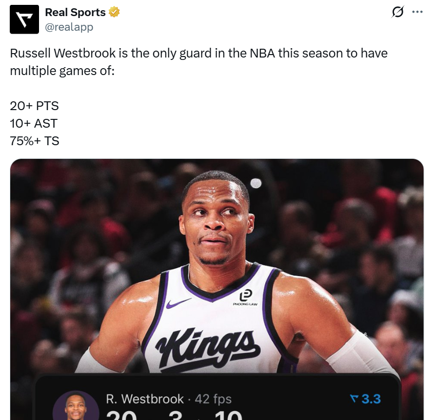 凭借这样的表现,威少也成为本赛季唯一一名以75%+的真实命中率得到至少20分10助攻的后卫。