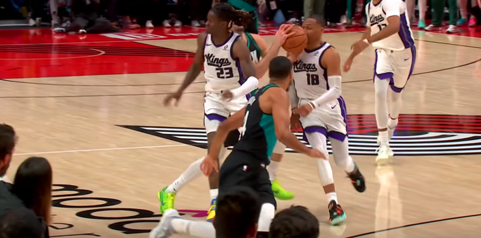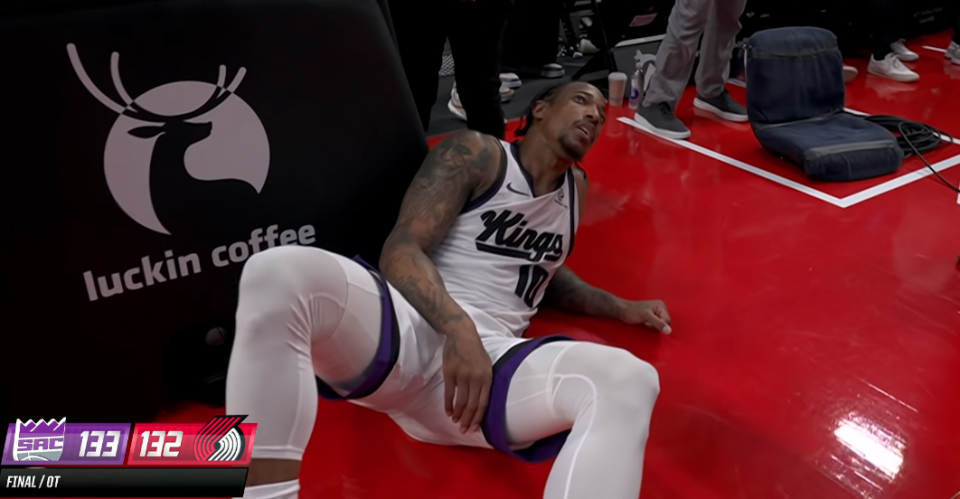 结果此时裁判响哨回看确认威少对阿夫迪亚犯规,无论是威少,还是国王主教练与替补席,乃至对手开拓者都一脸懵不敢相信这一切,经历大喜到大悲的德罗赞久久不能平静,直接坐在篮下看着大屏幕回放眼神空洞。