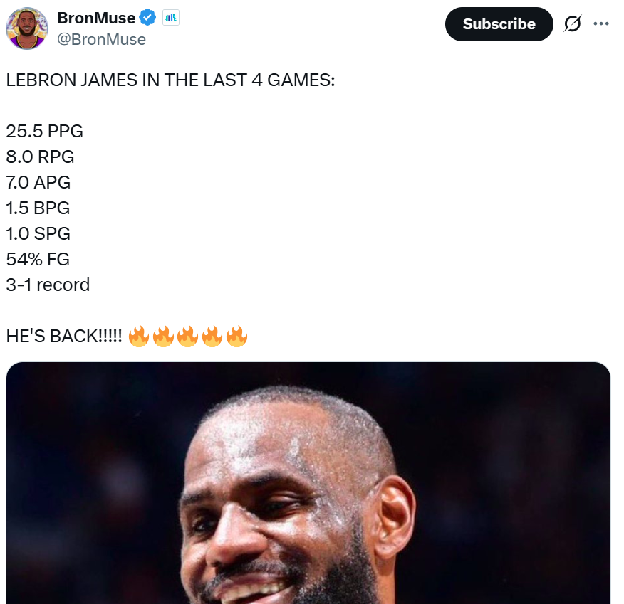 本场也是如此,东契奇适当让权后,詹姆斯表现进一步提升,17中8拿下28分7篮板10助攻1抢断,末节一人独揽10分。