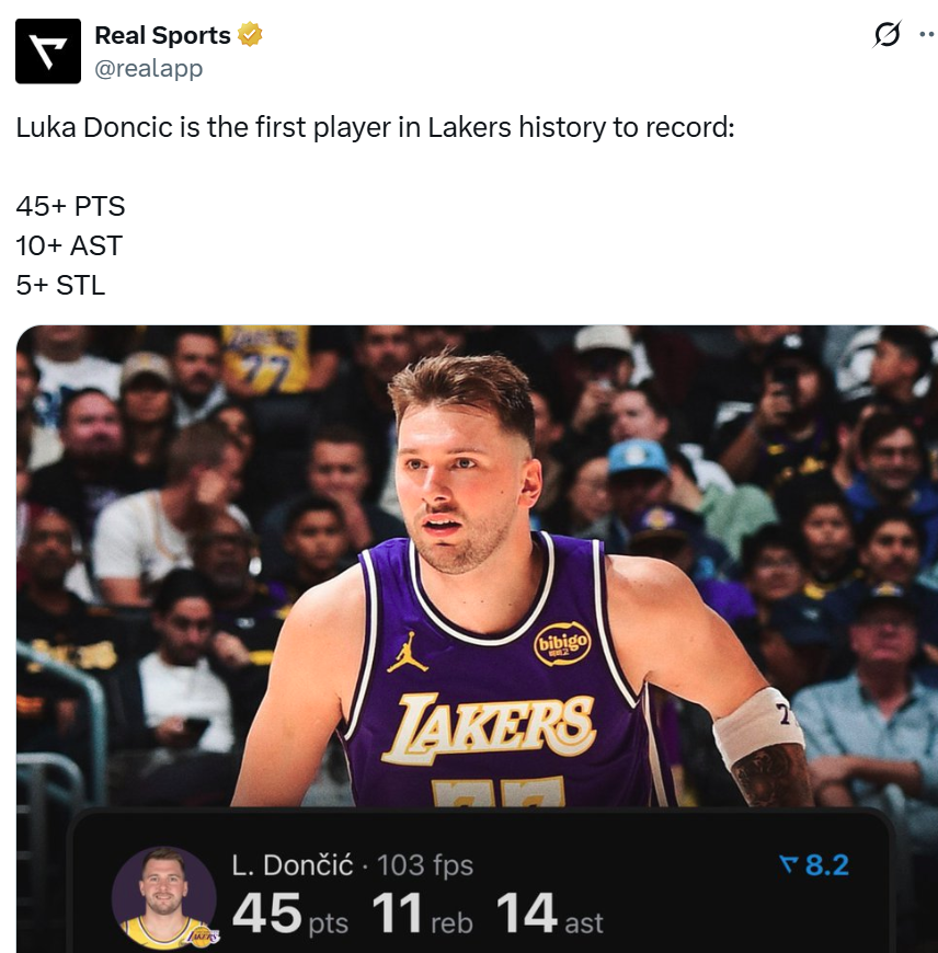 在里夫斯缺席的情况下,湖人队之所以能够完成逆转,保持与刷新数项联盟顶级纪录,核心东契奇可谓是居功至伟。