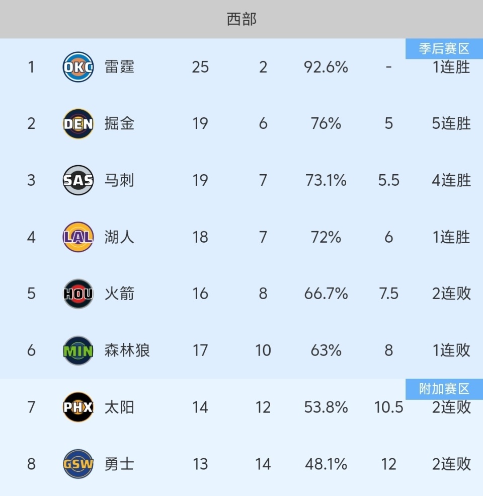 随着火箭爆冷输球、马刺119-94大胜,NBA最新积分榜出炉:火箭第5,马刺超湖人!