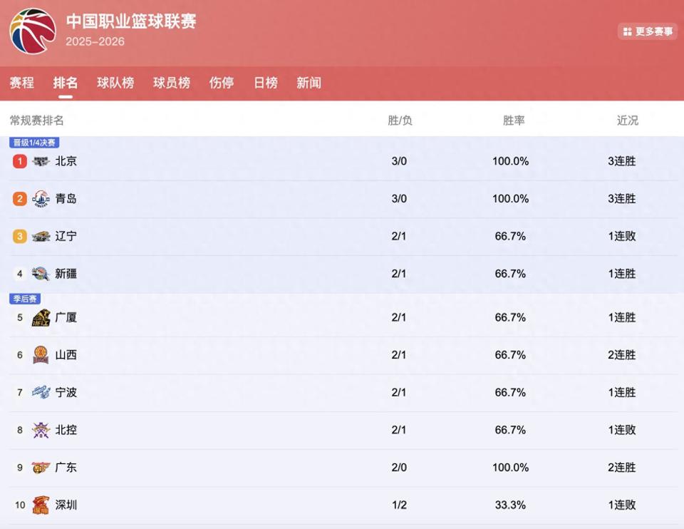 另外值得关注的是,广东男篮目前以两连胜暂时排在第九名。之所以排在这么靠后的排名,是因为第三场比赛还没有开始,如果广东男篮能够拿到3连胜,他们将会挤进前5。所以目前广东队整体的成绩包括排名还算是比较稳的,各位球迷不用太过于担心。