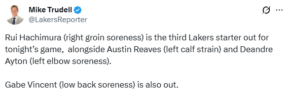 在洛城德比开打前几个小时,湖人官方更新了球队的伤病报告,八村垒因右侧腹股沟酸痛缺席本场比赛;此前艾顿(左肘酸痛)、里夫斯(左小腿拉伤)和文森特(下背部酸痛)都已经确定无法出战。