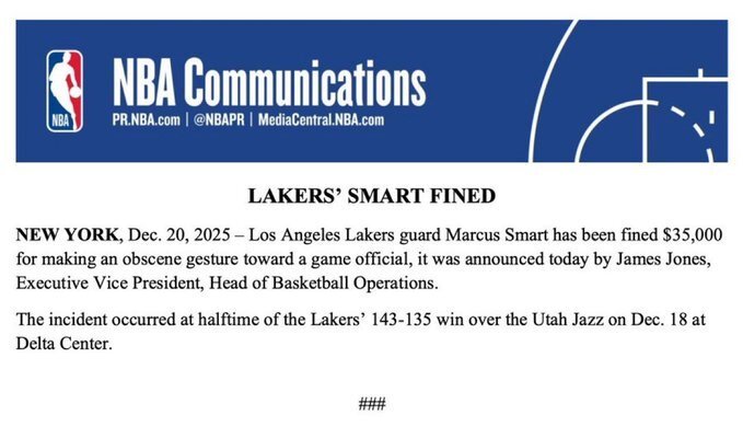 另外值得一提的是,NBA官方宣布,湖人球员斯马特因对裁判做出不雅手势,被罚款35000美元;在12月19日湖人143-135战胜爵士的比赛中,半场结束时斯马特对裁判做出了不雅的手势。