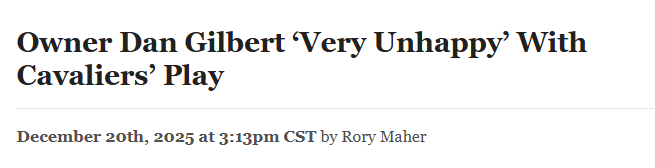 费多尔表示:“两位知情且与球队关系密切的消息人士透露,丹-吉尔伯特对球队现状深感不满。他打开电视看比赛,听到的是漫天嘘声——过去5个主场比赛里,嘘声四起的情况就出现了4次;他看到的是球队再度陷入两位数比分的落后局面,看到球队在下半场明明一度领先,最终却未能守住胜势。”