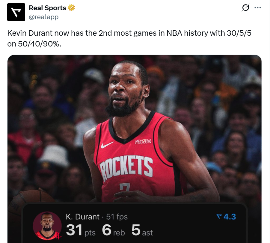 凭借这样的表现,杜兰特以180俱乐部(三项命中率为50/40/90%)砍下至少30+5+5的场数来到54场,成功追平伯德并列NBA历史第二,仅次于库里的61次。
