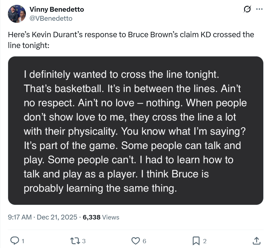 面对布朗这样的说法,“键盘大师”杜兰特赛后自然也迅速给出回应。