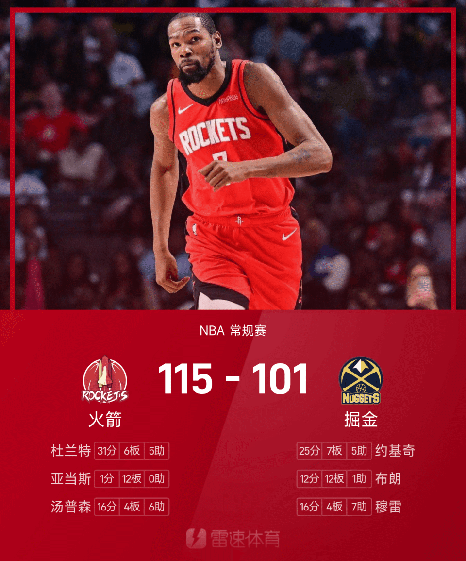 杜兰特31分6板5助攻,火箭击败劲旅掘金。