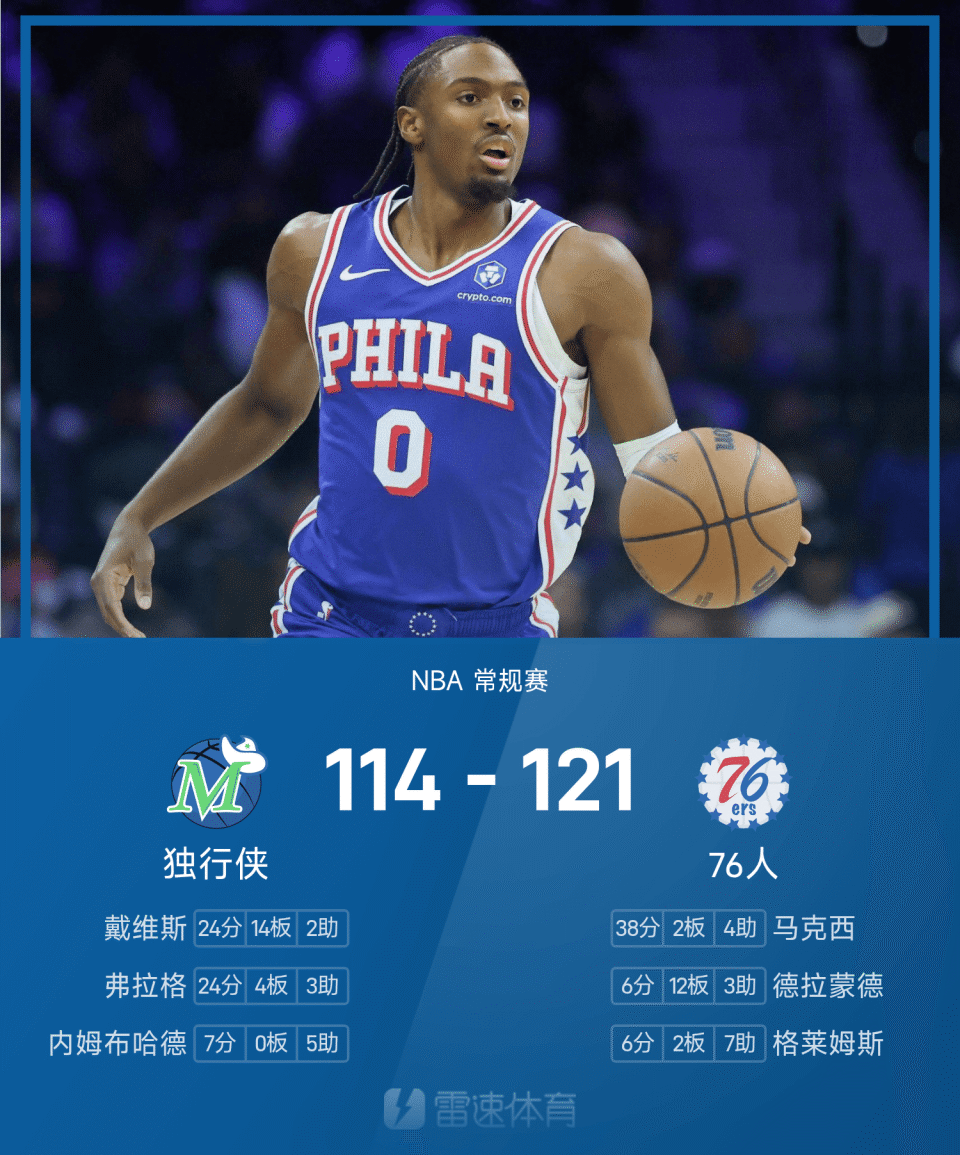 马克西高效砍下38分4助攻,76人险胜独行侠。