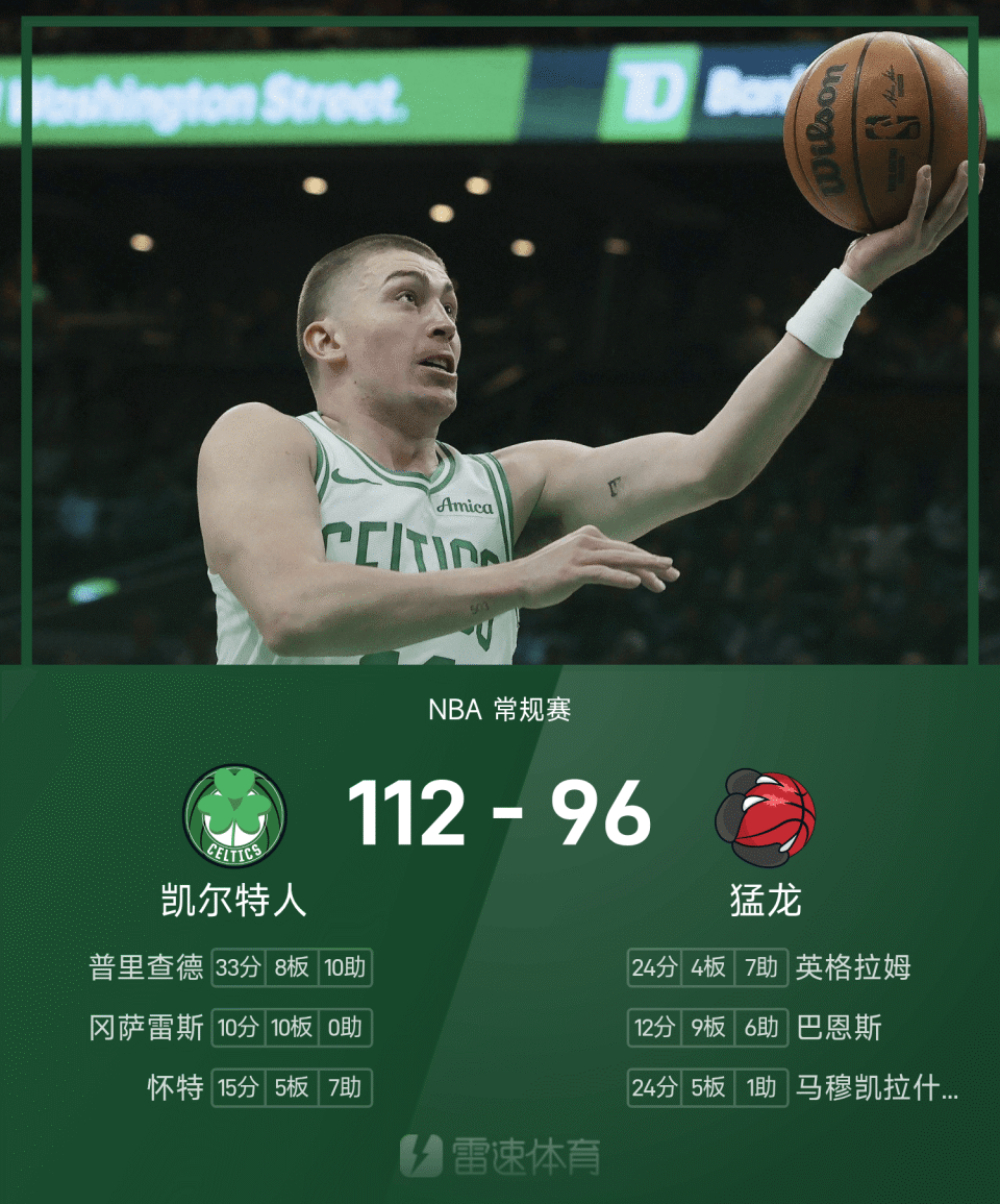 普里查德砍下33分8板10助攻,凯尔特人大胜猛龙。