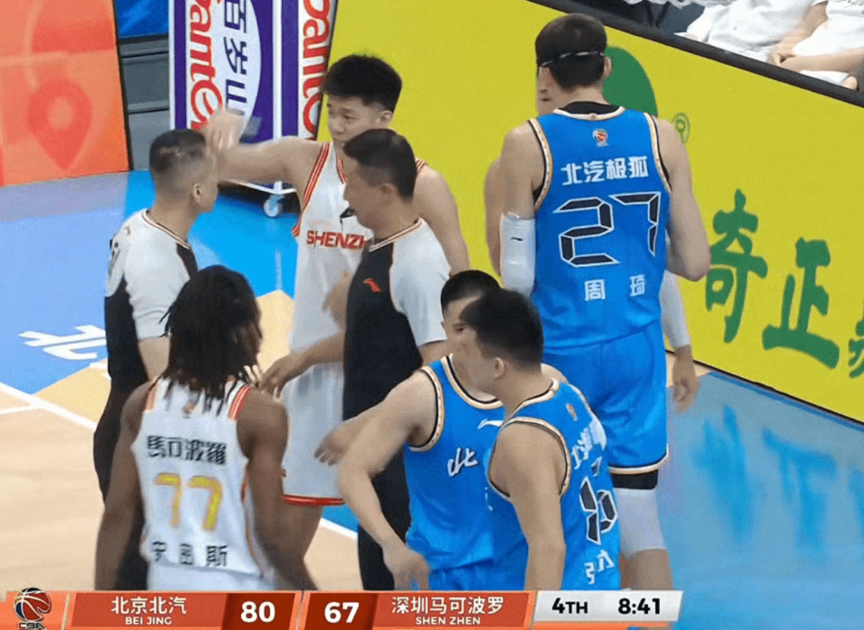 看到双方马上要打架,此时,北京队球员周琦做了2个动作,从而避免了冲突升级,周琦先是快速拉住了张才仁, 避免他与贺希宁过度接触。接下来,周琦又隔开了贺希宁,挡在了贺希宁的面前,让他无法与张才仁接触,毫无疑问,此时的周琦做得太对,太及时了……