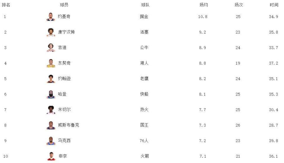 除了以上球员外,联盟还有很多组织能力优秀的球员,我们不妨直接上数据,据统计目前助攻榜前十分别是约基奇(场均10.8个),康宁汉姆(场均9.2个),基迪(场均8.9个),东契奇(场均8.8个),杰伦-约翰逊(场均8.2个),哈登(场均8.1个),米切尔(场均7.7个),威少(场均7.3个),马克西(场均7.2个),以及保罗乔治(场均7.1个)。可以看到排在首位的是约基奇,他是全联盟唯一场均助攻数量上双的球员,关键还遥遥领先身后的康宁汉姆。