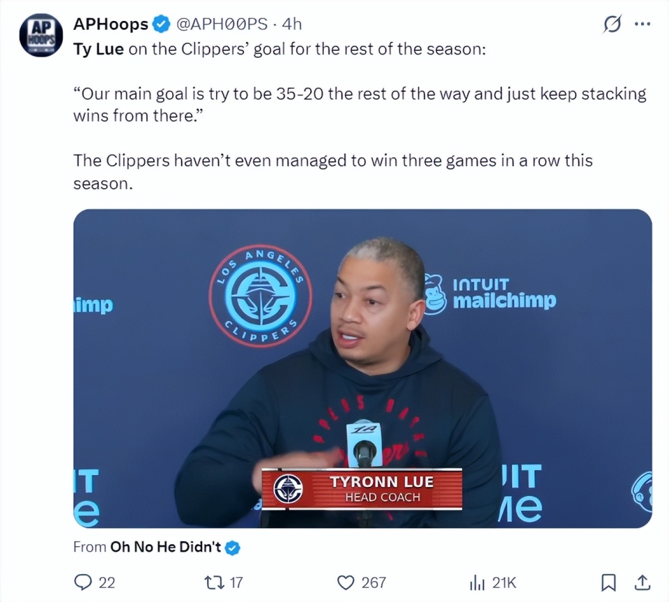 还想拿35胜20负?快船赢球船蜜仍刷解雇泰伦卢 阻雷霆状元签就成功?