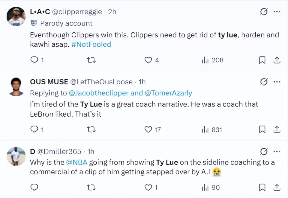 有很多的船蜜都认为球队该解雇泰伦卢同时应该交易掉科怀-莱昂纳德;泰伦卢只有在执教勒布朗时有过高光瞬间,他并不适合执教其他的球员与球队。