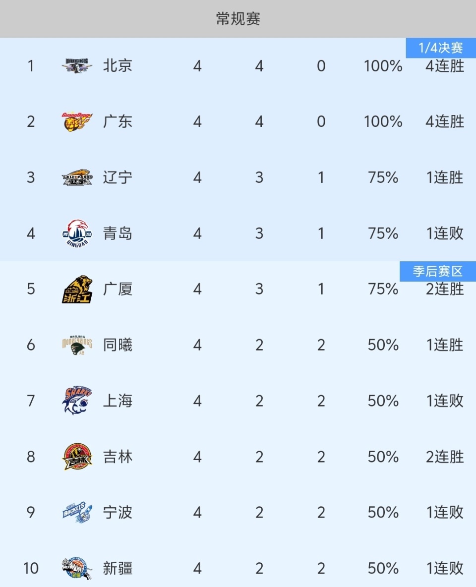 北京时间12月21日,CBA常规赛继续进行,广东男篮主场89-80击败了青岛队,豪取4连胜的同时,送给青岛队赛季首败,广东目前和北京队是唯二保持不败的球队了,他们排名前两位,卫冕冠军浙江广厦主场97-90击败了上海男篮,广厦排名第5,上海第7!