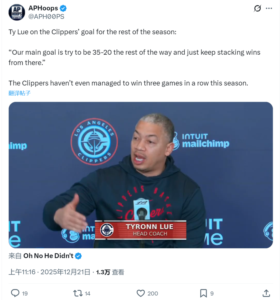 北京时间12月21日,NBA常规赛:快船主场vs湖人。随着鹈鹕今天大胜步行者,快船暂列西部倒数第一。截至赛前,快船6胜21负。泰伦卢在发布会上豪言:“我已经告诉全队,接下来55场我们至少要35胜20负,甚至更好的战绩!”