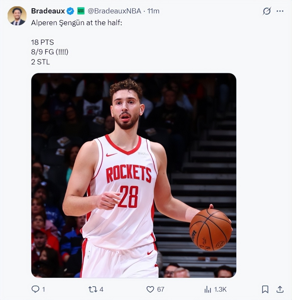 上半场打完申京17分钟,9中8,拿到18分2篮板2抢断1盖帽,命中率88.9%,申京就是火箭上半场领先国王两位数的关键。