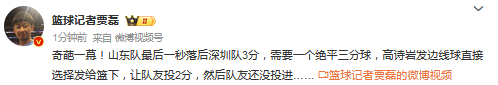 篮球记者贾磊发文点评:“奇葩一幕!山东队最后一秒落后深圳队3分,需要一个绝平三分球,高诗岩发边线球直接选择发给篮下,让队友投2分,然后队友还没投进”。