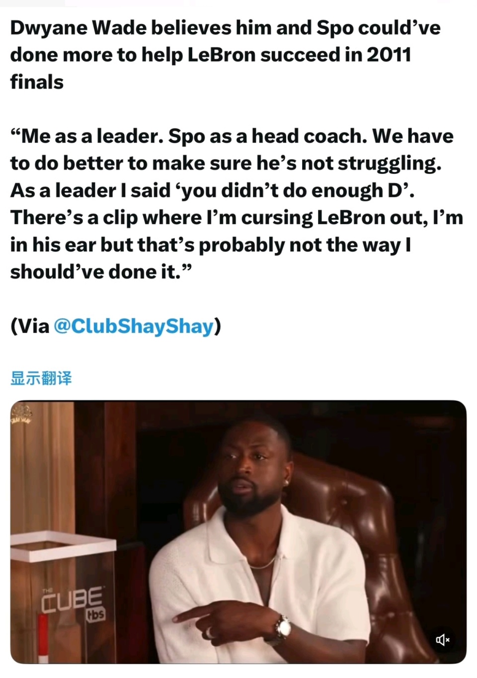 韦德还提到了一个具体细节,有段录像里他在对詹姆斯爆粗口,贴着耳朵说话。韦德承认:“但现在回头看,那可能并不是我应该采取的方式,是我错了。” 当年他可能觉得是在鞭策队友,但现在他明白了,那种方式在高压的总决赛里,可能没起到好作用。
