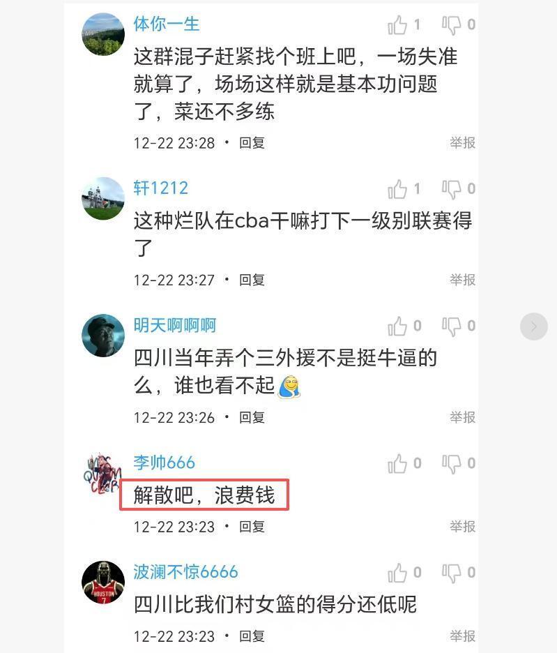 球迷也是为四川队感到叹息,“唉,没钱就啥也不行了”、“这样的球队留在CBA没有意义”、“解散吧,浪费钱”。不知四川队还能挺多久?不解散也尽快卖了吧。你们说呢?