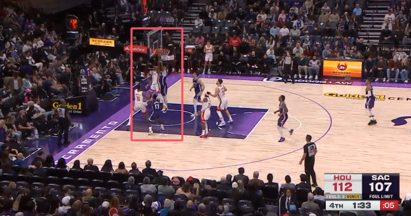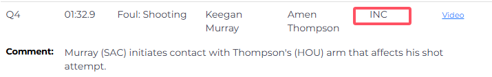 第二次漏判发生在末节还剩1分32秒,裁判报告指出,穆雷防守时接触到阿门的手臂,影响了后者的进攻,这应该吹罚穆雷防守犯规,阿门本该获得两次罚球,这一次漏判是火箭吃亏。