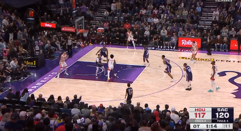 本场比赛,火箭在末节领先14分的情况下被拖进加时,威少命中绝平三分,杜兰特错失三分绝杀;加时赛,两队打得十分刺激,最后2.2秒施罗德命中三分准绝杀,杜兰特再次投丢绝杀球,最终火箭加时124-125惜败国王。