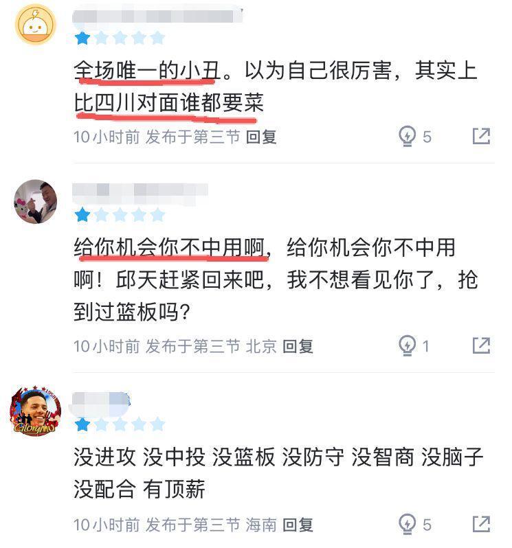 开赛以来一直低迷的范子铭,本以为面对全华班的鱼腩四川男篮可以为自己赢得证明,没曾想在球队狂胜对手51分的情况下,范子铭仍然掉链子。在这场比赛周琦只打了7分钟的情况下,许利民有意让范子铭找找自信,结果他在攻防两端,依旧不改自己“欢乐喜剧人”的属性。