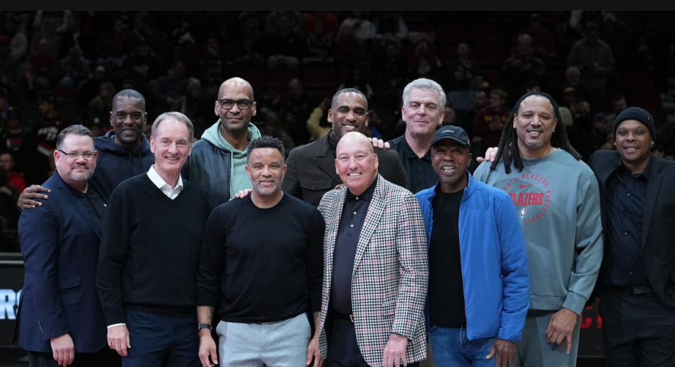 比赛中场休息时段,1999-2000赛季的开拓者队成员合影留念,其中包括当时的主帅老邓利维,球员斯塔德迈尔、威尔斯、格兰特、史密斯等人。