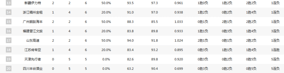 此外,目前也有2支0胜5负的球队,分别是天津,四川,其中四川是全华班出战,上一场只得到53分刷新CBA历史第二低分。