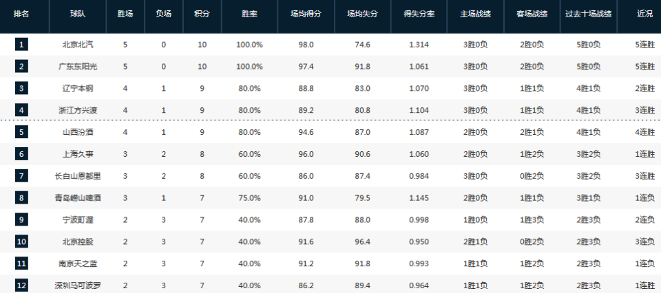 随着广东男篮击败广州男篮,新赛季开局拿到5连胜,成为联盟唯二的不败球队,另外一支5连胜球队则是北京男篮。