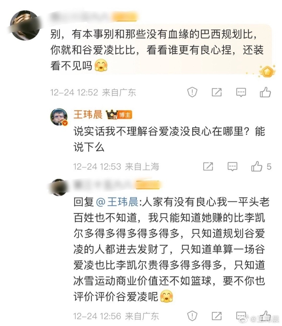 对此,王玮晨表示:“谷爱凌怎么没良心了?她小众项目在国内挣得比李凯尔还多很多,所以没良心?李凯尔为国家队正赛就打了5场,世界杯1胜4负,之后再也没上了。谷爱凌为中国队出场41次,拿下39枚奖牌,重要金牌拿了个遍,国家队比赛需要就上,收入也全靠高商业价值来的赞助收入。谷爱凌比李凯尔在国内挣得多,不是天经地义?”