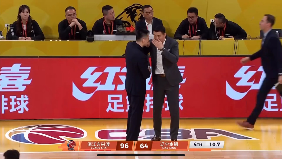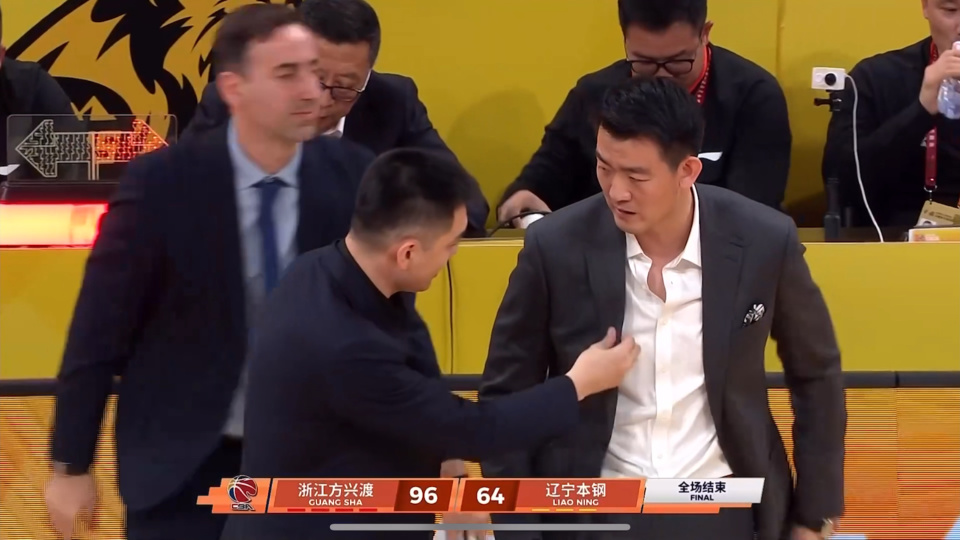 进入第四节比赛已经被打花了,即便浙江已经换上了全华班练兵,但辽宁队主帅杨鸣依然将小外援留在场上使劲抡,试图在最后时刻哪怕多得两分,让这场惨败的面子上稍微好看那么一点。胜负已分的垃圾时间,杨鸣坐在替补席上啃咬小拇指的罕见画面,或许更能说明这位冠军教头内心的煎熬与不甘。最后 24.5 秒,记分牌上 64 比 96 的悬殊比分显得格外刺眼,手握 32 分巨大优势的浙江广厦队直接放弃了进攻,朱俊龙持球过了半场,随后回头询问了王博要不要继续打完这一次进攻,得到否定答案之后,朱俊龙任由时间流逝,全队静待比赛结束。比赛结束的哨声响起后,双方主帅进入握手致意环节,请注意,杨鸣紧紧握着广厦主帅王博的手,镜头前特意凑到王博耳边低语了几句,还抓住王博的西装领久久不放手,相信是询问哪买的!这一幕幕被镜头捕捉下来了。