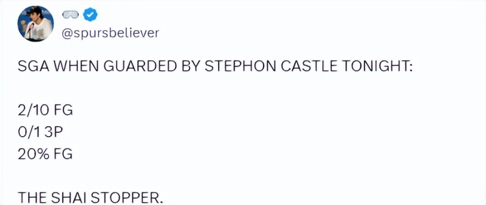 马刺球员的运动能力很强,退防速度足够快,亚历山大也无法像过去那样利用快攻取分。不得不说,亚历山大面对马刺很难处在自己的节奏,打得非常别扭。卡斯尔无疑是马刺限制住亚历山大的头号功臣。