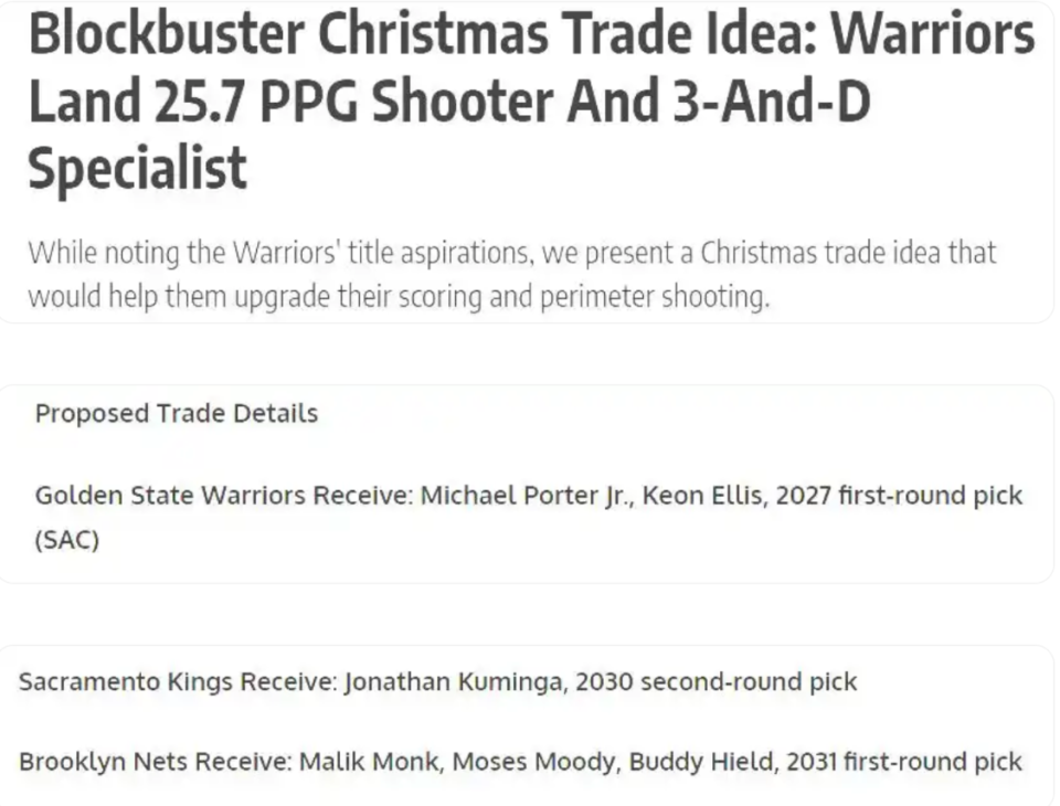 勇士得到:迈克尔·波特二世、基恩·埃利斯、2027年首轮签(来自国王)