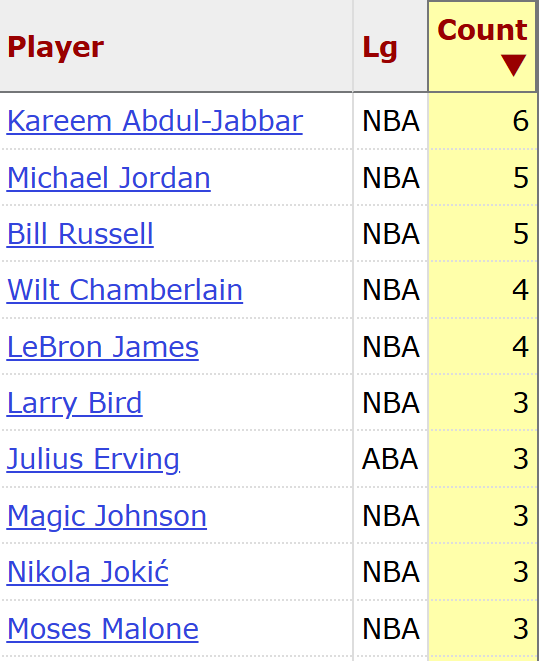 三项MVP榜单排名第一,充分说明了约基奇目前的统治力和被看好程度。如果约基奇本赛季能再次当选MVP,那将是他第4次获此殊荣,在NBA历史上能至少获得4次常规赛MVP的球员目前只有5位,分别是张伯伦和詹姆斯(4次)、比尔-拉塞尔和乔丹(5次)、贾巴尔(6次)。约基奇有机会追平张伯伦和詹姆斯。