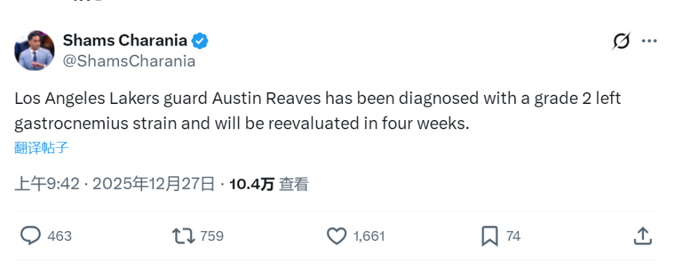 北京时间12月27日上午10点左右,据NBA名记Shams报道,湖人后卫奥斯汀-里夫斯被诊断为左小腿腓肠肌二级拉伤,大约4周后接受复查!里夫斯此前遭遇小腿一级拉伤,只休战三场比赛就复出了。没想到在圣诞大战导致伤情加重……