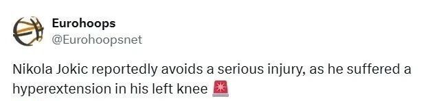塞尔维亚媒体Meridian Sport从掘金内部人士处非正式获悉,约基奇的伤势属于膝盖过度伸展,并未造成严重损伤。